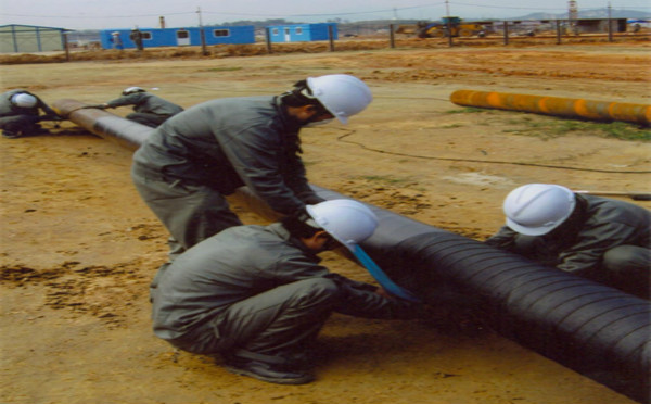 3.纏繞聚丙烯防腐膠帶必須待底漆表干后進(jìn)行,繞帶過程中必須保持均勻漲力,纏平貼實(shí)、搭接一致,纏好膠帶后,在埋地前為克服造成起泡現(xiàn)象,需將防腐管道采取遮陽保護(hù)的方法掩蓋24小時(shí)。